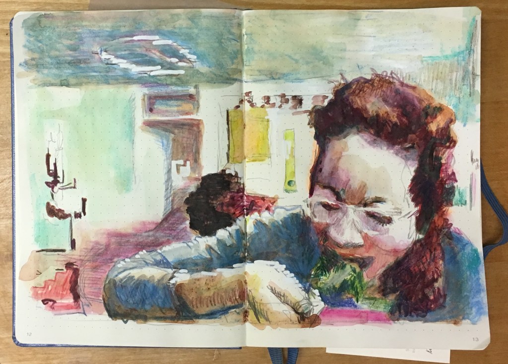 man kann ja auch am Bildschirm miteinander essen — aber vor allem fand ich es lustig, Claudia beim Essen zu zeichnen… die Skizze heißt jetzt „Saturn verschlingt seine Kinder“ ( frei nach Goya ;-))