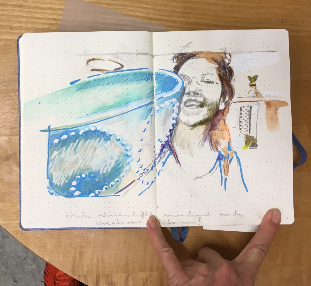 Aus dem letzten Crashkurs Portrait und Figur zeichnen hat sich entwickelt, daß wir uns ab und zu im Café treffen, zum Austauschen und zusammen zeichnen. Das ist für mich ein super Genuß, denn da bin ich nimmer Lehrerin, sondern habe einfach Teil an einer kleinen sehr anregenden Peers-Group, die gegenseitig Skizzenbücher anschaut, ratscht und Kaffee trinkt – und dann aber auch sehr schnell den Übergang findet zum aktuellen Dranbleiben und flott und fesch und experimentell herumzeichnen.